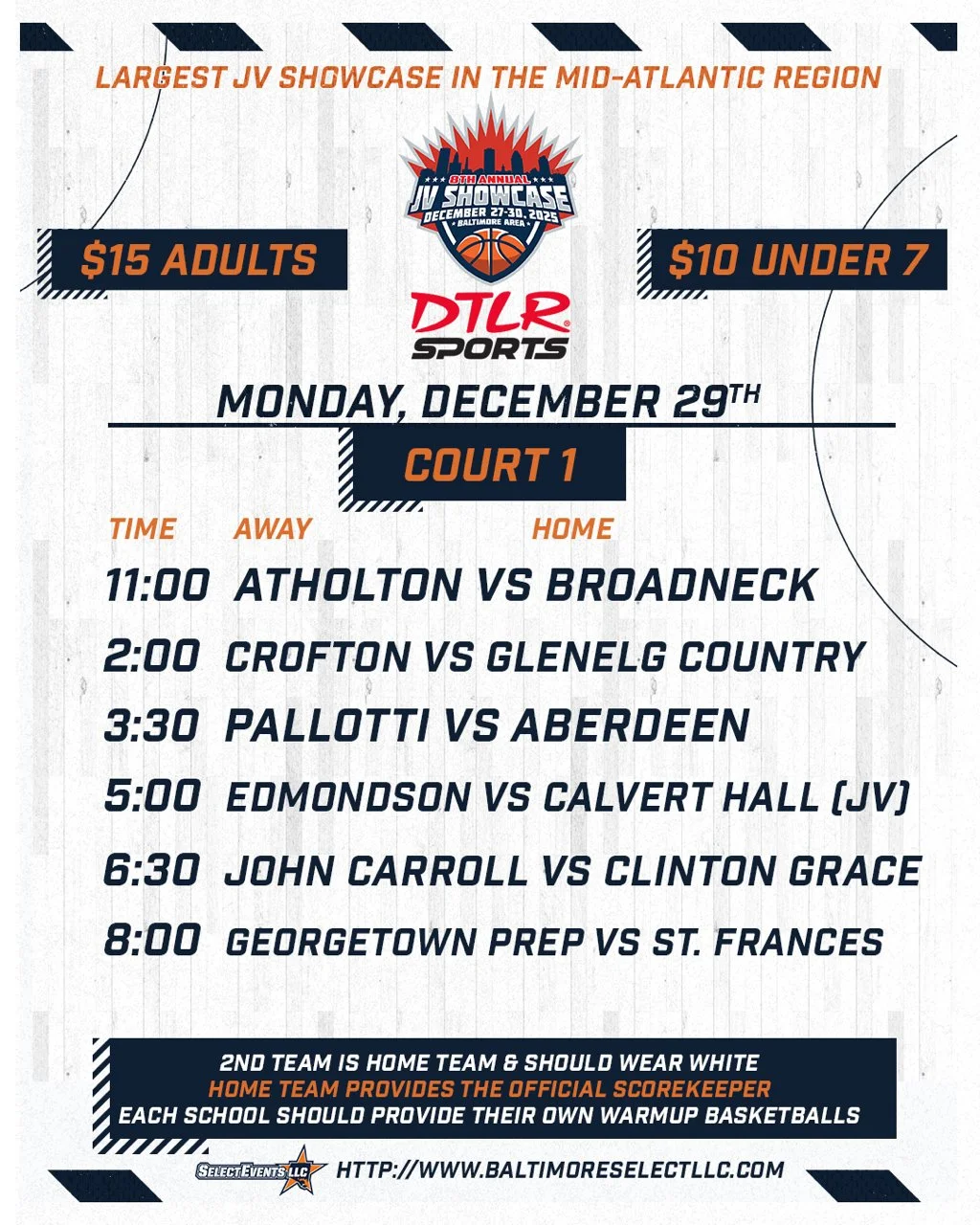 Find the final schedule below for the 2025 AAU Basketball Holiday Tipoff, December 27th & 28th, 2025, at St. Frances Academy